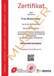 Nach erfolgreichem Abschluss erhalten Sie ein Zertifikat des Zentralen Berufsverbands, das Ihre Qualifikation als Ultraschall-Kavitation-Expertin bestätigt und Sie zur professionellen Anwendung der Technik in Ihrem Studio berechtigt.