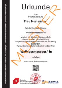 Nach erfolgreichem Abschluss erhalten Sie eine Verbandsurkunde des Zentralen Berufsverbands, die Ihre Qualifikation als Wellnessmasseur/in bestätigt.